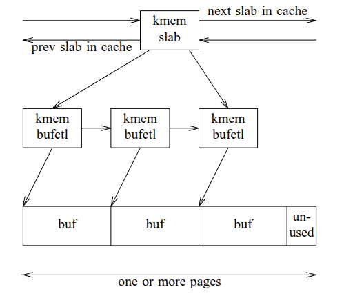 每个 slab 的内容由 kmem_slab 数据结构管理, 该数据结构维护 slab 在缓存中的链接、引用计数和空闲缓冲区列表. 反过来, slab 中的每个缓冲区都由 kmem_bufctl 结构管理, 该结构保存空闲列表链接、缓冲区地址以及指向控制 slab 的反向指针.
